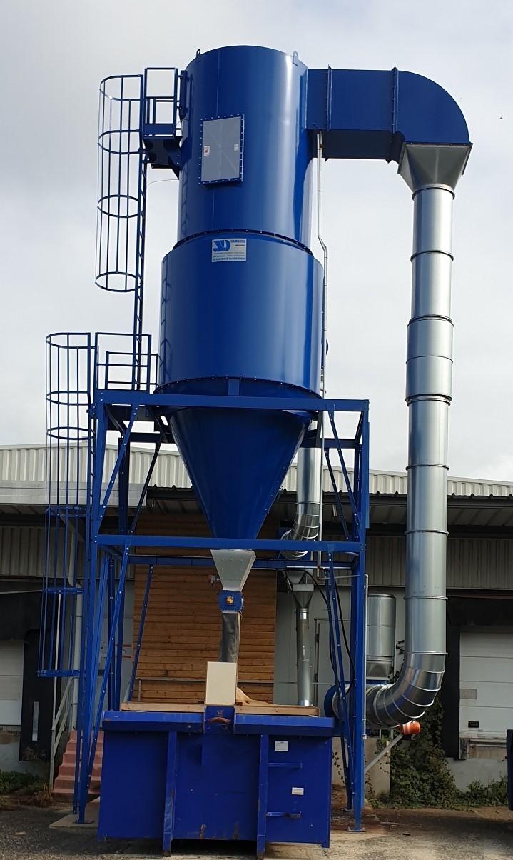 Broyeur de chutes de bois et palettes avec extraction du Broyat par aspiration et transport pneumatique dans le Silo de la chaudière.