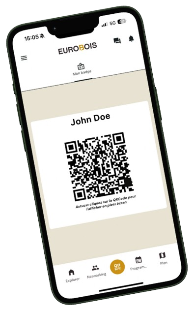 Eurobois Connect sera votre indispensable de poche ! Puisque vous y retrouver votre ebadge d'entrée au salon, uniquement accessible depuis l'app.