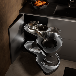 Une vue d'ensemble parfaite pour le meuble d'angle de cuisine. Avec le système LeMans, fini l'espace perdu, dans un mouvement élégant et coordonné le contenu vient à...