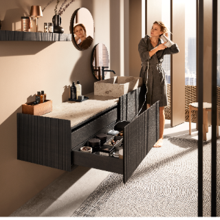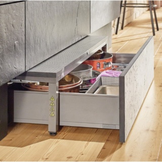 La simplicité du concept de plateforme ne s’arrête pas là : une variante d’attache-façade avec la même position de perçage pour les tiroirs simples et une autre pour les bloc-tiroirs suffisent pour mettre en œuvre l’ensemble du programme MERIVOBOX et ses différentes possibilités de design : avec tube, avec BOXCOVER (insert de grande dimension) ou avec BOXCAP (réhausse métallique).